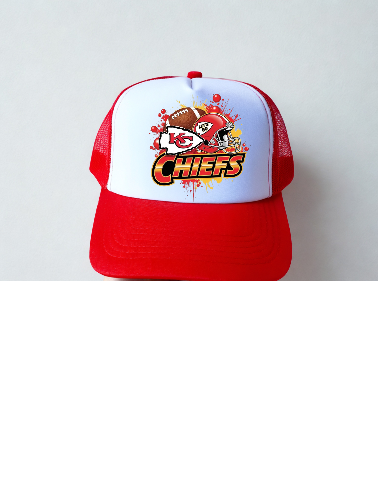 Show your team pride wherever you go with the CHIEFS Trucker Hat. Its classic design offers a comfortable fit and breathable mesh back, making it perfect for game days or casual outings. Represent your favorite football team in style and keep the sun out of your eyes with this must-have accessory. Elevate your fan gear and stay cool while cheering on the Chiefs!