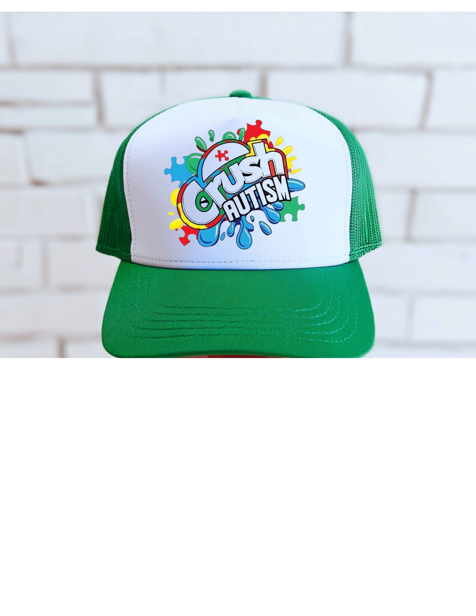 Show your support with the CRUSH AUTISM trucker hat, designed to raise awareness and spark conversations. Its comfortable fit and breathable mesh back make it perfect for everyday wear, while the bold design proudly sends a powerful message. Wear it to stand out and champion the cause with confidence.
