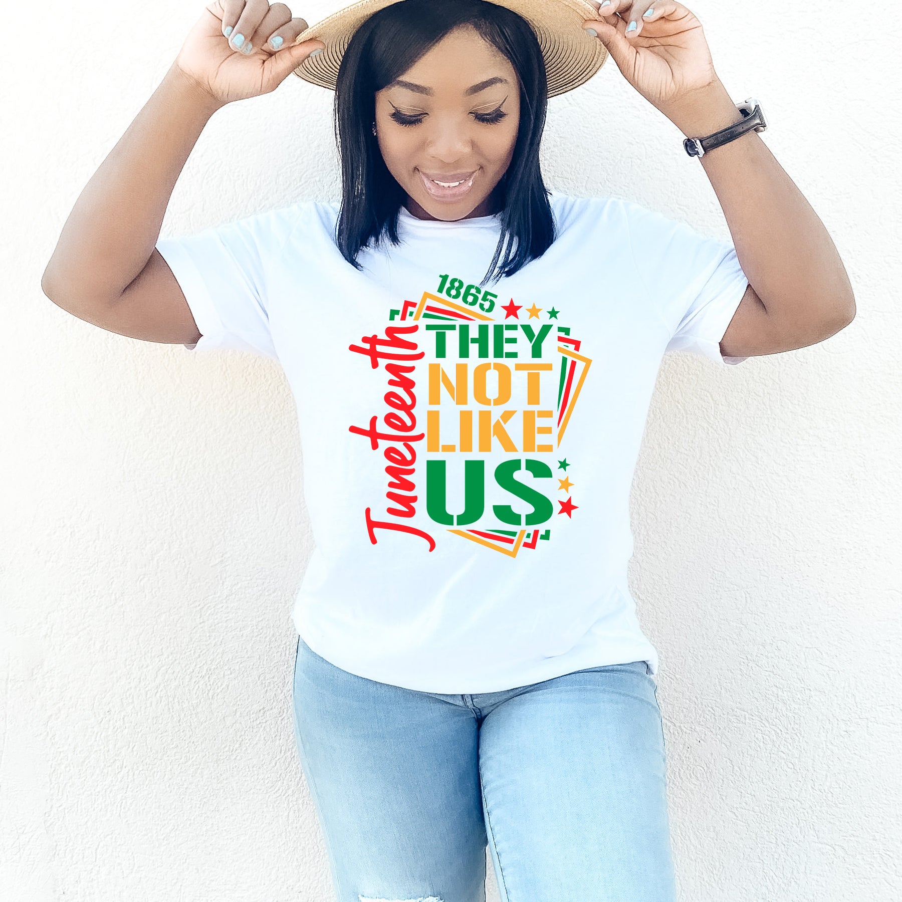 # JUNETEENTH THEY NOT LIKE US Wear your truth unapologetically. This Juneteenth essential speaks to those who refuse to compromise their identity or values. The striking design captures the defiant spirit of liberation and self-determination—a wearable reminder that authenticity is your superpower. Perfect for commemorating the holiday, amplifying your message, or simply standing apart from the crowd. Built for comfort and impact, this piece transforms everyday wear into a powerful statement. Be seen. Be heard. Be unapologetically you.
